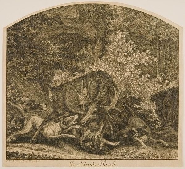 Curator: J. Zaal's "Wild Boar Hunt" presents a frenzied tableau. The immediate impact is one of intense energy and chaotic entanglement. Editor: Note how the artist has structured the composition—a visual pyramid of bodies, culminating in the boar's defiant head. The linearity of the dogs emphasizes the underlying tension. Curator: The boar, often a symbol of courage and ferocity, finds itself besieged. Hunting scenes carry layers of meaning, power, control over the natural world. Editor: And observe the detailed rendering of each animal, from the hounds' straining muscles to the boar's bristling fur—the material reality is almost palpable, no? Curator: It suggests that the artist was interested in conveying the intensity of the chase, the brutal reality of man versus nature. Editor: Indeed. It's a visceral exploration of dominance, framed through a starkly realized visual structure. Curator: A reminder of the symbolic weight carried by such scenes throughout art history. Editor: A very telling piece that invites contemplation of its composition and themes.