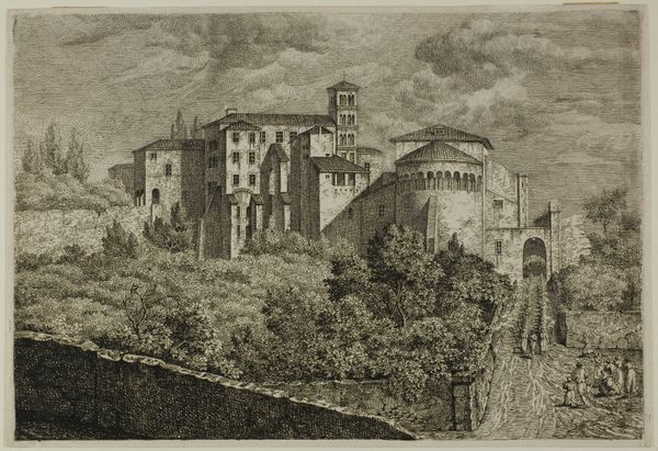 Herman van Swanevelt created this print, "View of the Vineyard of the Villa Mamsrona," using etching techniques. Observe how the composition is structured around contrasts. The stark, geometric architecture of the villa sharply contrasts with the organic forms of the surrounding landscape. Notice the textures achieved through the etched lines, creating a palpable sense of depth and volume. The sky, rendered with delicate, horizontal lines, adds to the overall atmospheric perspective. This interplay between the natural and the constructed, the rough and the smooth, speaks to a broader discourse within art history about humanity's relationship with nature. Van Swanevelt's choice of etching, with its inherent capacity for detail and texture, adds another layer to the work’s meaning. The lasting impression of this piece lies in how Swanevelt uses the formal qualities of line and form to engage with enduring questions about space, place, and our perception of the world. The composition invites ongoing re-interpretation.