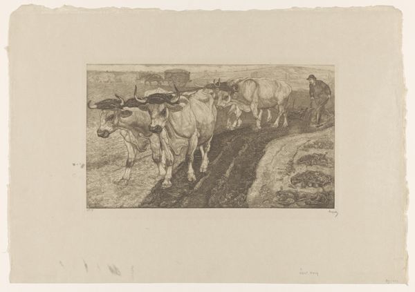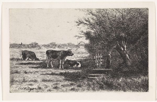 Editor: So this is Johannes Karel Leurs' "Landschap met koeien," placing it sometime between 1875 and 1936. It's an etching, almost feels like a pencil drawing. I'm struck by the depiction of labor here; there's a figure milking a cow while others rest. What can you tell us about the context surrounding a work like this? Curator: Well, let's consider the materials. This is an etching, a print. How does that affect its value as a representation of labour? Think about it, etching is itself a laborious process, isn't it? Reproducible. Accessible. What kind of a market were these images intended for? Was it aiming to reach those represented? Editor: I suppose I hadn’t considered the means of production and how it shapes the art itself. A print makes it more widely available...so maybe to people who have never even seen a farm or cows. Is it about romanticizing labor? Curator: Romanticizing or documenting? Perhaps both. Look at the detail – the lines creating textures of the cows' hides, the grass. It speaks to an engagement with the materiality of rural life. What is the labor of depicting labor itself? Consider too that during this period, industrialization pulled labor out of rural settings, commodifying both the product and the laborer. Editor: So, this isn’t just a picture of cows and a farmhand; it's engaging with industrialization, market economies, class structures… It gives you a lot to consider. Thanks! Curator: Precisely. The method, material, and motive cannot be easily untangled.