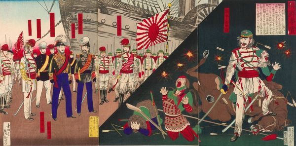Mizuno Toshikata created this woodblock print titled "Long Live the Great Empire of Japan! Image of the Great Victory at Pyongyang" in the late 19th century. The print celebrates a Japanese victory during the First Sino-Japanese War. The image is rich in visual codes. We see a heroic Japanese officer on horseback, leading his troops to victory under the light of a full moon. Cultural references to the glory of the Japanese Empire are apparent here. Understanding the context of the Meiji Restoration is crucial. During that time, Japan was rapidly modernizing and expanding its military might. This print should be seen in the light of government propaganda. The print reflects a shift in Japanese art towards nationalistic themes. To understand it better, we might examine newspapers and other publications from the period. The meaning of this artwork is contingent on its social and institutional context. It serves as a reminder of the power of art to shape public opinion and promote specific ideologies.