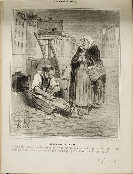 Editor: This is "The New English Restaurants in Paris" by Honoré Daumier. It looks like a lithograph. The scene is set in a restaurant, and the figures seem a bit caricatured, almost grotesque. What do you see in this piece, focusing on its composition? Curator: Note the stark contrast between the detailed foreground and the sketchier background. The foreground figures are rendered with precise lines, creating a sense of depth. Consider also the use of shadow, particularly around the seated man's face. It emphasizes his expression, drawing our eye. Editor: So, the artist is using contrast and detail to guide the viewer's attention? Curator: Precisely. Daumier masterfully employs these formal elements to create a focal point and imbue the scene with a specific mood. It invites us to decode the narrative through visual cues. Editor: I see it now; it's like the composition itself tells the story. Curator: Yes, and by analyzing the form, we gain insight into Daumier's technique and intention.