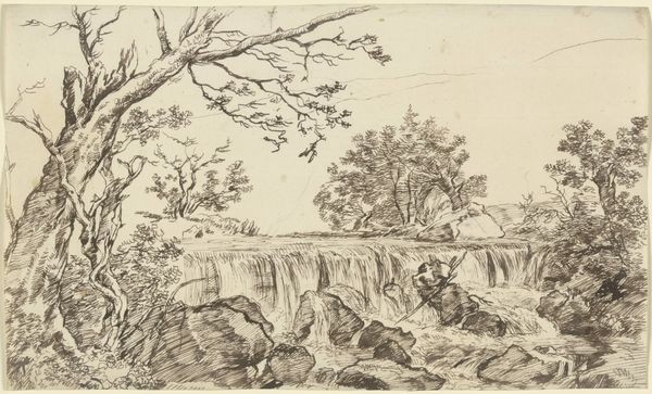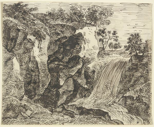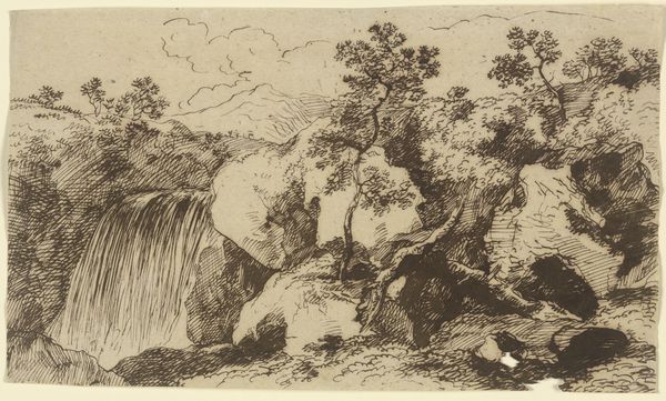 Editor: Here we have Franz Kobell's "Landscape with Waterfall," rendered with pen, ink, and chalk. It seems to capture the raw, almost volatile energy of nature, doesn’t it? What story do you think this landscape is trying to tell us? Curator: Well, given the context of the 18th century, consider the evolving perception of nature. Before Romanticism fully took hold, landscapes often served as idealized backdrops, but drawings like this started to capture a more “sublime” experience. It’s not just pretty; there's an element of untamed power. How do you see that reflected formally? Editor: I notice that the waterfall itself dominates the composition. Its powerful verticality, contrasted with the more horizontal strokes describing the land… almost a forceful takeover of the land itself? Curator: Precisely! And think about the consumption of landscape imagery at that time. Growing urban populations began to appreciate "natural" scenery in artistic form, and, with social changes afoot, idealized landscapes gained more value for their projection of personal freedom and direct encounters with nature. Consider that these were often commissioned or purchased by burgeoning merchant classes or members of court interested in country estates. Editor: So, was the act of *collecting* images of landscapes like participating in an idea of liberation and ownership? Curator: Exactly. Patrons exerted their power through owning art, dictating subject matter and style. This particular piece may suggest control through careful visual observation; and the artist certainly found value by participating in this transaction and power play. Who controlled nature – both represented in art and experienced directly? Editor: That is some food for thought about artistic value then and how the public would engage with work. Thanks for helping me better understand! Curator: My pleasure. It's crucial to view art through a critical lens, questioning whose perspectives are valued, and who dictates its value.