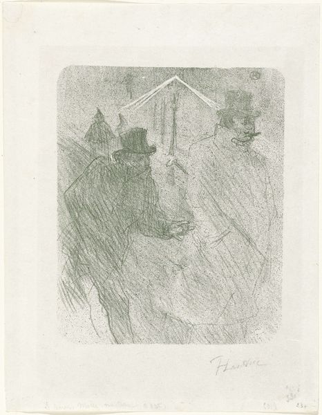 Editor: Here we have Jan Toorop's "Lezende man aan het einde van een rij," a graphite and pencil drawing from 1886, housed at the Rijksmuseum. It has a somewhat gloomy mood, a blurry feeling like it's a rainy day, or even just a half-forgotten memory. What is your interpretation? Curator: Indeed, the atmospheric conditions of the piece are immediately striking. Notice how the composition directs the eye, how the repetition of vertical lines generates a powerful sense of recession into the background, the linear perspective of the figures receding to the rear. How does this affect the viewers experience? Editor: Well, it does give a strong sense of depth. I find myself focusing on the figure closest to us because of the higher contrast compared to the background figures. He stands out due to the detailed pencil work, while the figures behind him blur into indistinct shapes. Curator: Precisely. Consider then the surface and medium. The contrast between the solid, shaded form of the foreground figure and the light pencil work used in the background to express reflection, wet pavement, etc. The artist plays with depth through textural contrast, what art historians have called ‘optical mixing’. What’s your understanding of how light interacts with these surfaces? Editor: Ah, it seems that by varying the pencil pressure, he manipulates light and shadow, giving a translucent quality to the rain and figures behind, unlike the more solid man in the foreground. Curator: Precisely. One might say Toorop is inviting us to contemplate the formal devices as an integrated and unified system of marks. Editor: That’s interesting, looking at it from a formal perspective changes my initial reading of it entirely! Curator: Indeed. By focusing on the artist's formal approach and treatment of the graphic surface we may uncover more nuanced considerations than previously apparent.