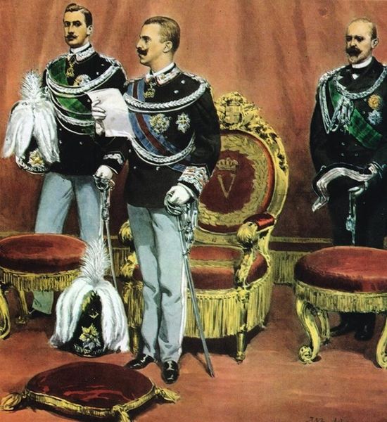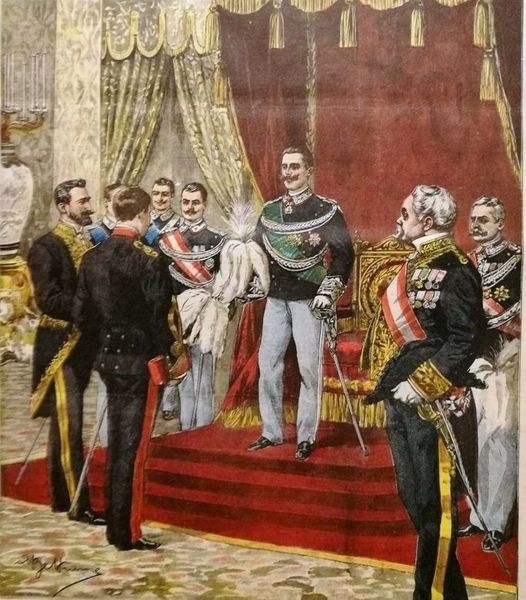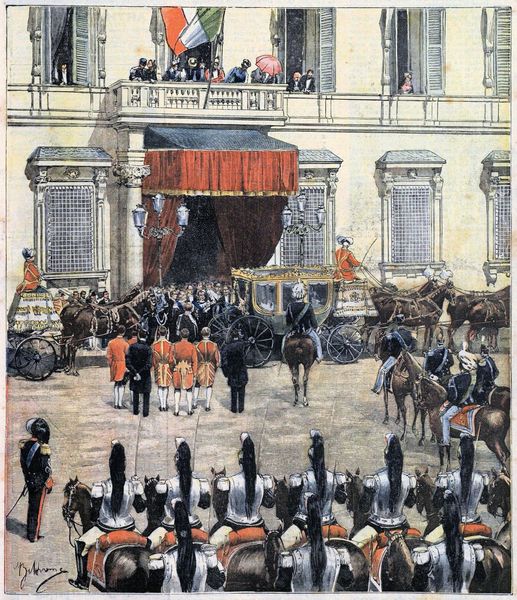 Editor: Achille Beltrame's oil painting, "Vittorio Emanuele III Inaugurates The XIII Legislature," from 1909 really strikes me with its impressive depth of field. The composition pulls the viewer right into what looks like an incredibly ornate scene. What visual elements stand out to you in this piece? Curator: Immediately, I’m drawn to the hierarchical structure embedded within the painting's composition. Observe how Beltrame utilizes linear perspective and varying levels of detail. The King is at the visual apex, brightly lit and sharply defined, contrasted with the receding tiers of figures, becoming less distinct with distance. What effect do you believe this compositional choice achieves? Editor: I think it really emphasizes the King's authority, literally placing him above everyone else in the space. Curator: Precisely. Note also the deliberate arrangement of colors. The crimson of the throne and drapes is visually dominant, drawing the eye, whilst the blacks and muted tones of the surrounding figures serve as a grounding element. Do you perceive a semiotic relationship between these color choices and the subject matter? Editor: Well, red is often associated with royalty, power, and maybe even sacrifice, which could connect to the King's role. The darker colors below maybe represent the people he governs? Curator: An astute observation. Consider further how the textures – from the sheen of the royal garments to the comparatively subdued rendering of the background – contribute to this structured visual narrative. Are there any other formal qualities that strike you? Editor: I am curious how the shift from Italian Renaissance style to a Modernist aesthetic influenced Beltrame’s technical choices. Curator: Indeed, by applying the theories of Modernism and Semiotics, we gain insight into not only what is depicted, but *how* it is depicted, reflecting shifting paradigms in artistic expression. Editor: Thank you; it's amazing to see how all the individual choices come together to support the artwork's central theme of leadership and societal structure.