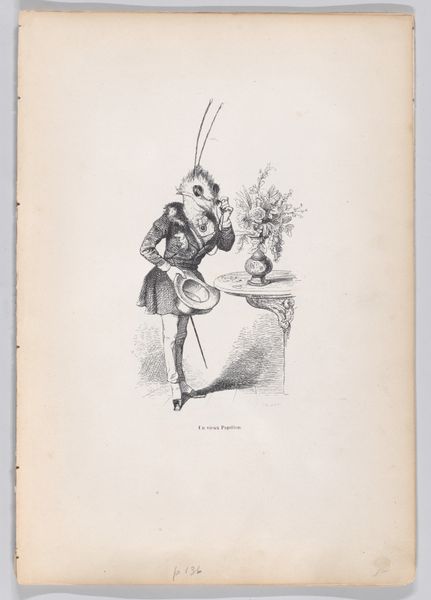 This lithograph, “What do you say about the butterfly hunt?” was created by J. J. Grandville in the 19th century. The texture and detail achieved through lithography allows Grandville to create a visually satirical and expressive image. The composition centres on an anthropomorphic figure, a fusion of human and bird, caught in the act of hunting butterflies. The structure of the image draws our eye from the butterfly net at the top, down the arching form of the hunter, to the butterflies fluttering near the ground. The lines are delicate yet precise, giving texture to the figure's clothing and a sense of movement to the butterflies. Grandville's work often uses animal-human hybrids to critique social behaviours. This print uses semiotics, such as the hunter's attire and tools, to comment on the absurdity of human pastimes and the desire to dominate nature. It challenges fixed notions of identity, using caricature to question human behaviour. The detailed lines and careful composition invite us to reflect on how we interpret nature and the boundaries between the human and animal worlds. It serves as a commentary on 19th-century society, reminding us that art often functions as a mirror reflecting back our own values and contradictions.