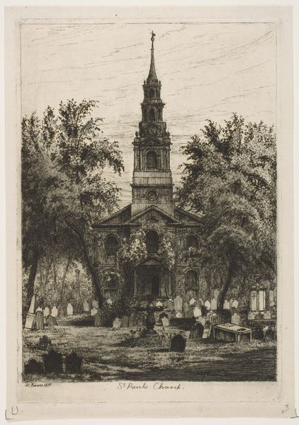 Carl Alexander von Heideloff created this drawing of Albrecht Dürer's grave in the St. Johannis cemetery in Nuremberg. The sepulchral atmosphere is emphasized by the somber palette and the eerie moonlight, which flattens the forms and heightens the contrast between the grave markers and the dark architecture of the church. Heideloff organizes the composition using a play of vertical and horizontal lines. The tombstones in the foreground lead our eyes towards the towering church spire, a clear symbol of verticality. The artist uses light and shadow to create depth, but the overall effect is one of surface and pattern, emphasized by the restricted tonal range and linear quality of the drawing. The symbolism here is intriguing. Dürer’s grave is set against the backdrop of a gothic church; these structural forms speak to the enduring legacy of artistic and spiritual tradition. The cool, almost detached, depiction suggests the rationalizing influence of the Enlightenment, re-evaluating historical and cultural symbols through a lens of objective observation. This interplay between tradition and modernity invites contemplation about cultural heritage.