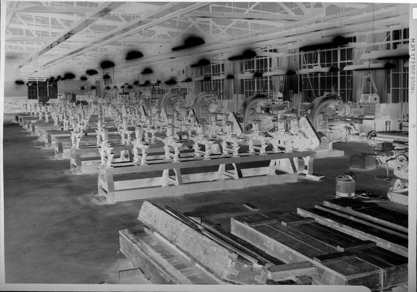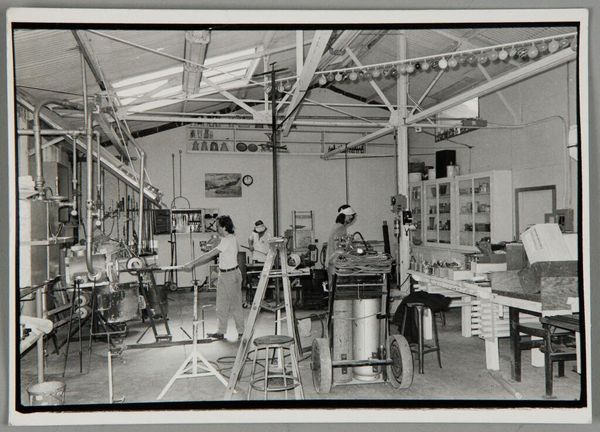Curator: This is an untitled piece by Martin Schweig. It depicts three women operating sewing machines in what appears to be a warehouse setting. Editor: The starkness of the image hits me first, the repetitive lines of the sewing stations creating a sort of oppressive grid. Curator: Exactly. Consider the social context: sweatshops, labor, and the repetitive nature of industrial work that defined the era. It brings to mind the garment industry and labor exploitation. Editor: The composition is crucial, though. The artist uses the geometry of the room to emphasize the women's confinement. Notice how their forms seem almost absorbed by the machines. Curator: Yes, and Schweig is highlighting the system, the institutional structures that both enabled and constrained these women. Editor: It's a powerful statement made through simple visual elements. The high contrast underscores the bleakness of their environment. Curator: Indeed, it is the photographic capturing and framing that elevates a seemingly everyday scene into social commentary. Editor: It's a bleak commentary.
