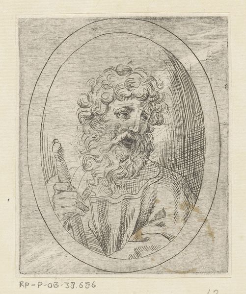 Curator: This intriguing image is called "An apostle resting his head on his right hand and holding a book," part of a larger series titled "Christ, the Virgin, and Thirteen Apostles." We believe it dates from between 1600 and 1640, though the artist remains anonymous. It's an etching done in ink, currently residing here at The Met. What are your initial thoughts? Editor: Melancholy. That's the immediate feeling. There's such weariness etched, quite literally, into the apostle's face. It makes you wonder about the burden of faith. The looping lines making up his hair and beard—it's like captured energy. Curator: Precisely! That contemplative pose, the hand supporting his head – it's a classical trope signifying deep thought or even sorrow. And the book he clutches… Knowledge can be a heavy weight. Editor: Absolutely. And consider the oval frame. It’s isolating, isn’t it? Focusing our attention solely on him. I wonder, who was this apostle intended to be? Each one carries such a specific weight, especially within art of this era. Curator: Ah, a good question. Given the lack of identifying symbols, we can only speculate. Perhaps this anonymity is deliberate. He could represent any believer grappling with faith's complexities. I think the print, as a multiple, might make that case more successfully. Editor: It’s a democratisation of contemplation, isn’t it? The ability to reproduce and share this image of deep reflection… It allows more people to sit with their doubts, their devotion. And the simplicity of the ink adds to the power—reducing the spiritual to simple, almost primal lines. Curator: I concur. It's this tension between the delicate etching and the weighty subject that I find so captivating. The artist uses a relatively light and easily portable medium to convey deep emotional and intellectual heft. Editor: I suppose it's a beautiful reminder that faith, like art, is both personal and universal. Boundless, yet framed. I love how such minimal ink can produce such rich visual effect. Curator: Agreed. The work invites us to our own moments of introspection, using art and faith as conduits.
