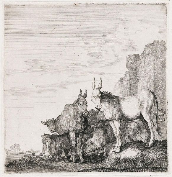 Curator: Look at this evocative scene; "Donkeys by a Wall" is a baroque engraving, quite possibly dating from between 1600 and 1760. The hand of Moyses van Wtenbrouck is the one who conceived this captivating world for us. Editor: It strikes me as somber, almost desolate. The texture is rough, the lines heavy. Are these animals resting or resigned? There’s a weight to the composition. Curator: Absolutely. Think about the context. During the baroque period, there was often a glorification of rural life, but also an awareness of its hardships. Donkeys, like those depicted, were commonly beasts of burden, symbols of the working class and their endurance in difficult socioeconomic structures. Editor: The positioning seems intentional. The ruined wall looms behind them, suggesting a past order crumbling. Are the donkeys meant to be allegorical? Is the ruin representing political instabiliy for instance? Curator: Precisely! The ruined architecture becomes a stand-in for societal instability, for empires fallen or for promises broken. The animals' seeming exhaustion might then be a metaphor for the peasantry burdened by historical forces outside their control. Note how the composition leads your eyes between the animals and that deteriorating wall! Editor: But aren’t we imposing a bit much of a modern social critique? What about simply the formal beauty of the print? The contrasting textures of the animals’ coats, for example, achieved through incredibly detailed cross-hatching? Curator: Never one without the other! Technique informs meaning, my friend. The meticulous depiction allows us to ponder, through social commentary, these complex relationships that exist between the land, labor, and structures of power that existed then... and now! Editor: You know, after this consideration, it does reveal itself as a compelling narrative—a tableau of labor, resilience, and silent commentary. Curator: Exactly! It compels us to reflect on continuities of class, work, and exploitation as they’ve continued across vast centuries of change. The piece transcends time.