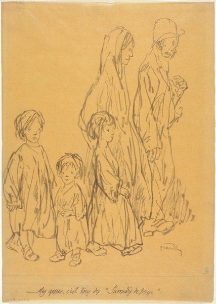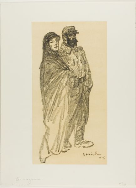 Théophile Alexandre Steinlen made this image, Orphans of War, with crayon on paper. The softness of the medium lends itself to the sombre mood and subdued palette, doesn't it? You can see how the medium is integral to its reception. The image presents a mother and three children cloaked in shadow, rendered with a flurry of layered strokes. Look at the way Steinlen uses the crayon to build depth and emotion. The lines are like whispers, suggesting rather than defining form, which creates an atmosphere of vulnerability. Notice how the mother's face is etched with sorrow, and how her veil seems to blend into the shadows that envelop her children. Her dress is formed of simple but artful lines, which bunch at the base of the image, drawing the eye and adding to the emotion of the work. Steinlen, like his contemporary Käthe Kollwitz, used his art to comment on social issues. Both artists used line to create emotional depth and to evoke empathy for their subjects, inviting us to reflect on the human condition. Isn't it fascinating how a simple line can speak volumes?