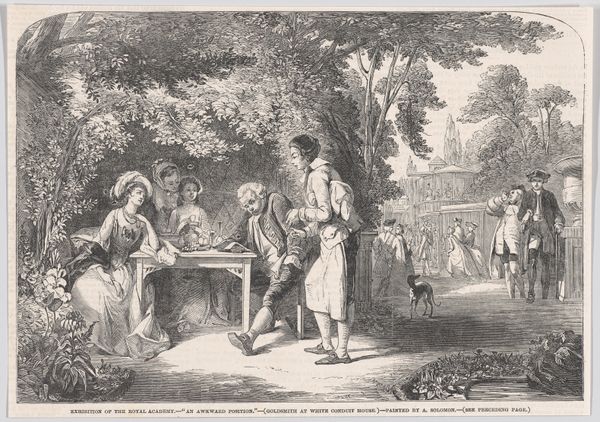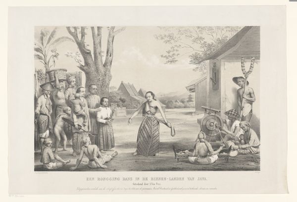 This is Pieter Tanjé’s etching, “Bruiloft van Cloris en Roosje,” made around 1730, held at the Rijksmuseum. Immediately, your eyes are drawn to the theatrical arrangement. An elevated stage to the left counterbalances the bustling crowd and the reader to the right, creating a dynamic visual rhythm. The composition here isn't just representational; it's deeply structured. The stage is set, quite literally, elevated to allow the viewer's eye to survey the scene. Note how Tanjé uses linear perspective to guide our gaze from the foreground's lively dance to the background's serene landscape, merging celebration with a broader sense of place. Observe the interplay of light and shadow. Tanjé masterfully uses it to define forms, creating depth and drawing attention to key figures, such as the wedding couple who are caught mid-dance. The artist uses the formal elements to construct a staged reality that invites us to consider the values and social rituals of the time. How might the arrangement challenge or reinforce established societal norms?