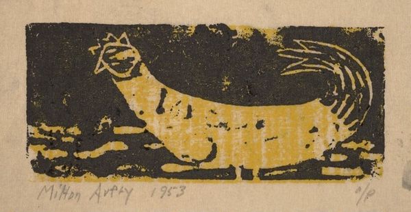 Milton Avery made this woodcut, Fancy Bird, in 1953. It’s all about the simple, gestural marks that describe the bird and its surroundings. I find myself drawn to the way Avery uses black lines to create the texture of the bird's body, kind of like a loose net draped over its form. You can see the grain of the wood coming through, which adds another layer of texture and depth. The colors, a muted green and stark black, are bold but also feel so calm, like the bird is quietly existing in its little world. It's cool how he suggests the bird's environment with just a few horizontal lines and some vertical marks at the bottom. Avery’s known for his simple shapes and blocks of color, and you can totally see that here, like maybe he was hanging out with Matisse. This piece has an abstract kind of simplicity, showing us how much can be said with so little.