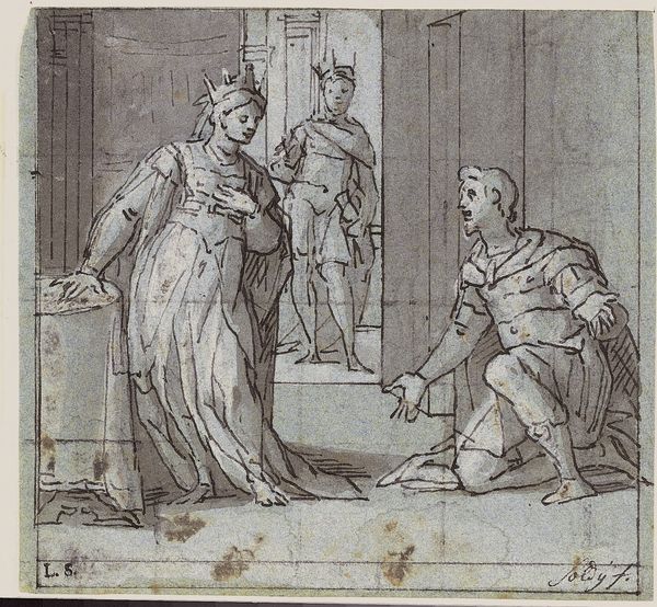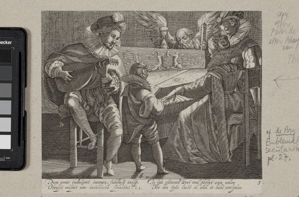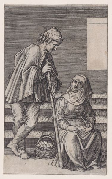 This is Nicolaes de Bruyn's "Joseph and Potiphar's Wife," created around 1600 using etching and engraving techniques. The scene, dramatically lit, stages a tense encounter. We observe Joseph recoiling from Potiphar's wife as she desperately grabs at his cloak. The composition employs a stark contrast between light and shadow, drawing immediate attention to the figures. The use of line and texture, particularly in the rendering of fabrics, highlights a meticulous attention to detail. De Bruyn masterfully uses these elements to intensify the drama, capturing the very moment of confrontation. The artwork also cleverly engages with the concept of space. It is both intimate, confined within the chamber, and open through the background's architectural elements, suggesting the world outside this private struggle. The work is not just illustrative; the careful balance of forms and the dynamic use of light and shadow serve to amplify the narrative's emotional and moral tension. In essence, this artwork invites us to decode its visual language, appreciating how form and content intertwine to create a compelling narrative.