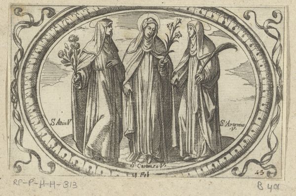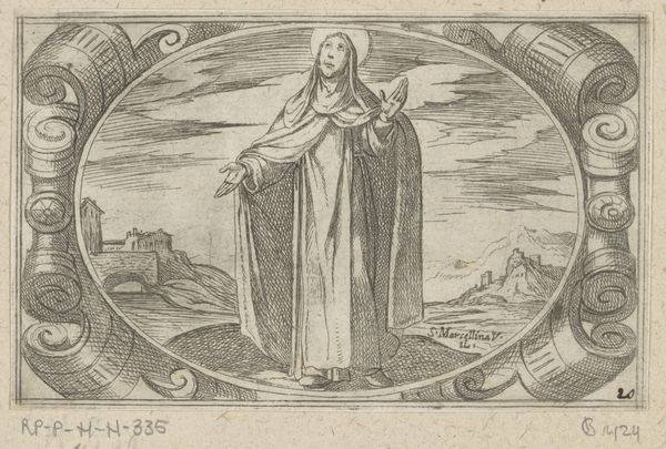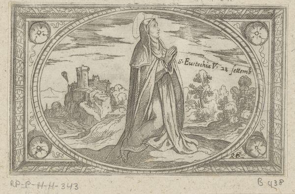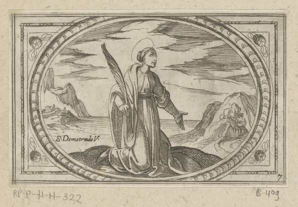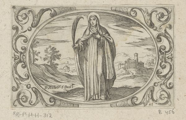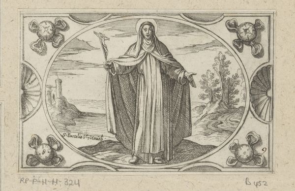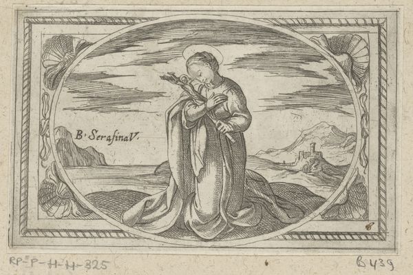 Editor: This engraving, "H. Benedetta" by Antonio Tempesta, dates from the late 16th or early 17th century. There’s something really serene about the woman in the center, but the landscape around her seems stark and almost isolating. How do you interpret this work, especially in relation to the historical context? Curator: This piece strikes me as a powerful commentary on the roles afforded to women, specifically within religious structures of the time. Notice how Benedetta is enclosed within this oval frame and a vast, almost barren landscape? This isolation speaks to a larger narrative, right? Women were often confined to domestic or religious spaces, their agency limited. Editor: So, her act of reading—what appears to be prayer or study—becomes a kind of quiet rebellion? Curator: Precisely. Education and literacy, especially for women, were often seen as subversive acts, offering an avenue for independent thought and challenging the existing social order. Consider how the Italian Renaissance was itself a time of intense political and religious upheaval. The very act of representing a woman engaging intellectually becomes significant. Editor: It's interesting how this small print can speak to such complex power dynamics. Were images like this circulated widely? Curator: Yes, prints were a powerful tool for disseminating ideas. So we have to ask, who was this image intended for? What kind of discussions was Tempesta hoping to inspire? And how can it challenge assumptions of who benefits most from religious spaces? Editor: I see. This work invites me to reflect on the continuing struggle for agency, both then and now, reminding us of the constraints some women still face. Thank you. Curator: Absolutely. It’s by interrogating those historical constraints and linking them to our current socio-political realities that art becomes truly transformative.