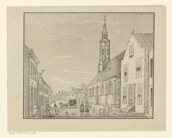 Jan de Beijer created this watercolor and pen drawing titled 'Gezicht in het dorp Harmelen,' now held at the Rijksmuseum. Notice how the composition leads your eye along the cobbled street, framed by buildings on either side, to the church tower at the center. The muted tones and the intricate linework evoke a sense of quiet observation. The drawing's structure reveals a careful balance between the architectural elements and the natural light. De Beijer uses linear perspective to create depth, drawing us into the scene. The repetition of the gabled roofs and window patterns creates a rhythm, while the variation in their heights and details prevents monotony. Consider the semiotic elements: the church tower, a clear signifier of community and faith; the figures engaged in daily activities; and the buildings themselves, each contributing to the overall narrative of a bustling village life. The use of watercolor, with its delicate washes and subtle gradations, serves to soften the scene, imbuing it with a sense of nostalgia and timelessness. This approach makes the artwork not just an aesthetic rendering, but also a reflection on the social and cultural values of its time.