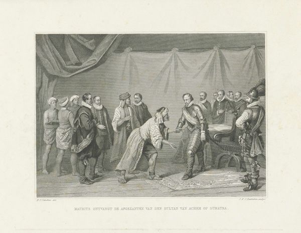 Editor: This pen and ink drawing, “Koning Willem I ontmoet zijn petekind,” from 1829, by Jean-Louis Van Hemelryck, feels staged, almost like a play. It's intriguing but I'm curious, what are the political undertones that might be present in an image like this? Curator: Well, considering its context, this work becomes far more than just a sentimental scene. Think about it: the House of Orange, having returned to power after the Napoleonic era, actively sought to cultivate a specific public image. This meeting between the King and his godson, likely carefully arranged and then memorialized in print, is deliberate image-making. What message do you think it conveys? Editor: Perhaps a message of approachability? The king seems to be bending down, trying to appear gentle… but maybe also a message of stability, suggesting the monarchy is ensuring continuity by supporting and embracing the next generation? Curator: Exactly! It reinforces a paternalistic image of the monarchy—caring, involved, and securing the future. But consider also how images like this circulated. Were they primarily intended for the elite, reinforcing their loyalty, or did they target a broader audience, aiming to garner popular support for the new kingdom after years of upheaval? And to what extent does the “realism” of the style mask this very carefully constructed representation? Editor: That’s a fascinating point. So, the drawing functions as a form of propaganda, carefully controlling the narrative around the monarchy? It makes you wonder how “real” the scene actually was and who the image served the most. Curator: Precisely. Looking at art through a historical lens really reveals how even seemingly simple scenes can be powerful political statements, shaping public perception. Editor: I see now, it's like looking at history through a keyhole and trying to understand the whole building! I’ll definitely approach historical art with more questioning eyes from now on.