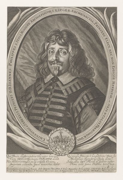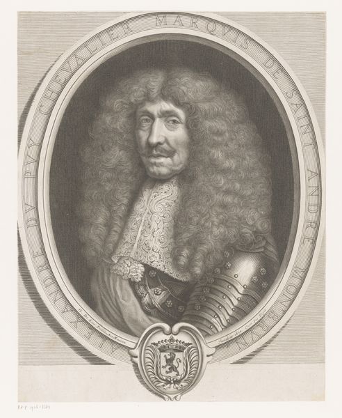 Editor: Here we have Pierre Daret's engraving of Jean Caylar d'Anduze de Saint-Bonnet, dating back to the 17th century. The subject's ornate armour really grabs you, yet his facial expression feels almost gentle. What strikes you most about the composition and technique? Curator: The beauty here arises primarily from Daret's control of line and texture. Observe the almost clinical rendering of the armour, the meticulous detail imbuing a metallic solidity and weight. The rendering of the face, although appearing soft initially, has a similar intricacy when closely examined; particularly note how varying depths and orientations of the etched lines yield shape, volume, and detail. Editor: So the formal aspects create this feeling of power mixed with softness? Is there a dialogue happening between those textures? Curator: Precisely. Consider the Baroque aesthetic generally; a theatricality combined with nascent realism. Daret exploits the formal contrasts inherent within the work – the unforgiving texture of the metallic armor versus the gentle face, the straightness of the depicted picture's border against the circular wig. What do those opposing relationships say? Editor: Perhaps the contrasts emphasize both the status and the humanity of the subject. The attention to detail highlights his importance, but also his presence as an individual? Curator: Indeed! Now, if you were to focus specifically on line alone, removing all other aesthetic judgements – what would the engraving offer? Editor: By isolating line as the primary formal element, the piece's overall structure becomes even clearer: the precise construction and control within the frame, and how important shape and volume is established solely through mark making. This perspective shifts the entire experience. Curator: Exactly. Analyzing only a work's formal properties yields a deeper appreciation of the artist's intent and control. A richer way to engage.