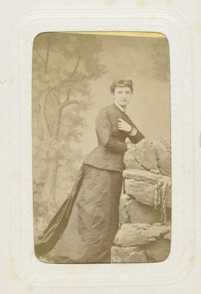 Curator: We are looking at a gelatin-silver print dating from around 1910 to 1920, titled "Portret van Catrien Deursma in een rok en een blouse, staand," made by Cornelius Arents. Editor: The monochromatic palette really flattens the image, and creates a sense of formal detachment. There is something quite austere and unwavering in the subject’s direct gaze. Curator: Arents plays with the tension between the detailed rendering of texture and the deliberate softening of the background. Note the crispness of the lace at the blouse’s collar and cuffs in stark contrast to the implied landscape behind her. This contrast serves to bring her into the foreground. Editor: Lace trim indeed functions as a delicate but meaningful adornment. Lace often represented refinement, status, and the embrace of feminine ideals. Catrien, as the subject, adopts some aspects of these attributes but seems determined to present herself without excessive ornament. Curator: Exactly. We observe Arent’s attention to line in her garment as well as in the architectural chair beside her. The severe verticality of the skirt countered by the curvilinear forms in the chair, with the floral or palmette shapes. This acts as a subtle visual echo of the domestic sphere, albeit one contained and controlled. Editor: The chair almost positions her. Notice that this specific symbol with these particular lines denotes civic responsibility, especially regarding public order, justice and morality. It almost feels ironic! Curator: And what does her steady gaze communicate to us? She is looking slightly up and out, her expression betrays no overt emotion. The background, the slight smile…It doesn't give up secrets easily! Editor: Perhaps it's less about withholding and more about presenting a self-assured modernity, very proper yet slightly rebellious. Ultimately, I find her enigmatic but undeniably present. Curator: The beauty in this lies within its elegant economy of means and its fascinating play between revelation and concealment. Editor: And that persistent symbolism really allows her agency to shine across the decades.