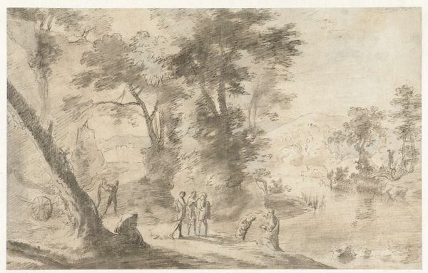 Editor: Here we have Roelant Roghman's "Landscape," created sometime between 1640 and 1692. It's an ink drawing on paper. I'm immediately drawn to how this seemingly simple scene is so carefully constructed. It almost feels stage-like. How do you see this work? Curator: Well, focusing on materiality, we see ink – a relatively inexpensive material – used to depict what appears to be a specific locale transformed into a generalized, even idealized, landscape. Roghman, using ink on paper, participates in a visual culture grappling with notions of land ownership and access. This piece, as a print, could have been easily circulated. Does its reproduction complicate the original context for you? Editor: Absolutely! Thinking about it as a print that could be distributed, it shifts from being a depiction of a particular place to almost a commodity. It democratizes the image, but does that dilute its value? Curator: Precisely! It invites questions about the artist's labor. Was Roghman aiming to capture the truth of a location, or was he, through the readily available and repeatable medium of ink, constructing a desirable, perhaps even marketable, vision of the Dutch countryside? Think of the economic factors inherent in producing such landscapes. Consider the relationship between labor, material, and market forces shaping artistic output. Editor: That's fascinating. I was so focused on the scene itself, but considering the production and consumption of this image changes my understanding completely. Now it speaks to me more about the Netherlands' relationship with its land as a resource. Curator: Indeed. The accessibility and affordability of the materials themselves – ink and paper – combined with the reproductive capacity of printmaking, played a key role in shaping both the creation and reception of landscape art during the Dutch Golden Age. We are invited to examine the work's physical existence as crucial to understanding its cultural role. Editor: This has completely opened my eyes to thinking about art beyond just what’s represented, to considering how and why it was made! Thanks. Curator: My pleasure! It’s the convergence of those elements – subject matter, production methods, and consumption – that brings real depth to our understanding.