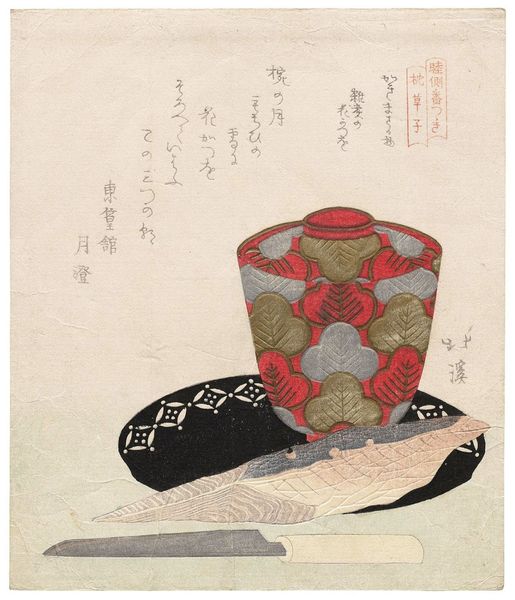 This woodblock print, made by Kubo Shunman, presents us with a covered document box, its lid adorned with the understated elegance of fern patterns. Such boxes, historically, housed precious documents, hinting at secrets and stories carefully preserved. Note how the box is not merely an object, but a vessel, pregnant with meaning. We see these containers echoing across cultures—the reliquaries of saints in medieval Europe or the carefully sealed sarcophagi of ancient Egypt, all safeguarding something sacred. The fern pattern itself evokes a sense of deep time and endurance, recalling the Romantic fascination with nature as a conduit to primal emotions. This symbolism transcends mere aesthetics; the box becomes a powerful locus of cultural memory. It is as if, subconsciously, we all yearn to preserve and protect our histories, our identities, and our deepest selves. The contents of this box hold echoes of our collective past, and the anticipation of what it holds engages us on a profound, almost instinctual level. The enduring presence of such motifs, these 'pathos formulas,' illustrates a timeless human impulse—to imbue objects with the weight of history, to connect with something larger than ourselves.