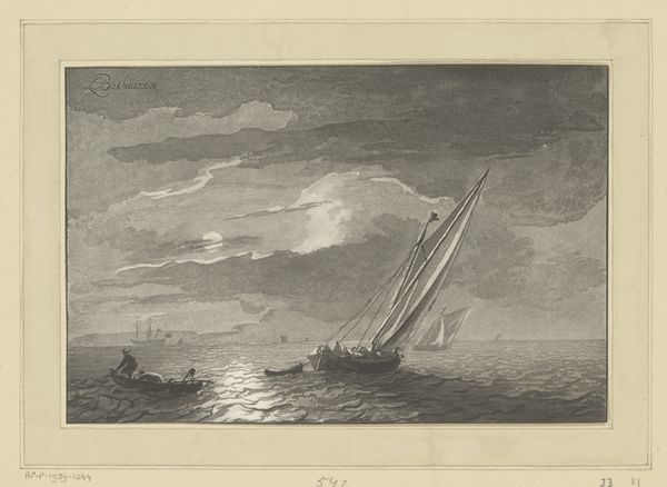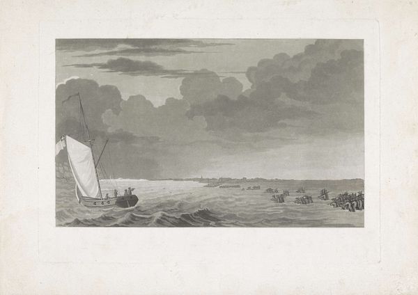 Editor: So this is "Storm op zee met figuren die van een schip vluchten," or "Storm at Sea with Figures Fleeing a Ship," potentially from 1774, an engraving by Richard Earlom. It's so dramatic, the ships look completely at the mercy of the storm. What do you see in this piece? Curator: This print offers a window into the Romantic era's fascination with the power of nature, specifically the sea, as a metaphor for human vulnerability. But what societal anxieties do you think such depictions reflect? Consider the 18th century – a time of burgeoning colonial expansion via naval power, and also increased maritime disasters. Editor: I guess the prevalence of shipwrecks might speak to fears surrounding the costs of expansion? That there were lives being lost amidst all this progress? Curator: Exactly. The individuals fleeing the ship are reduced to anonymous figures against the vastness of the ocean. This anonymity allows viewers to project their own fears onto the scene, engaging with broader questions about power structures, both natural and man-made, and our individual insignificance in their face. This also comes on the heels of Enlightenment philosophies focusing on the individual - and challenging power. How might this image reflect that change? Editor: So, instead of a glorious, triumphant depiction of naval power, we get something that undermines it and humanizes the experience of those who might suffer for it? Curator: Precisely. And it subtly challenges any notions of inherent power. We see this theme represented later across other works like Théodore Géricault's "The Raft of the Medusa". Editor: It's unsettling to consider how such historical factors are at play, and to recontextualize the artwork with new frameworks. I am now seeing the image not as simple Romantic scenery but as a symbol of that particular intersection between power, fear, and nature. Curator: Indeed, situating art within these broader sociopolitical narratives really deepens our understanding and encourages richer dialogues about representation and its impact.