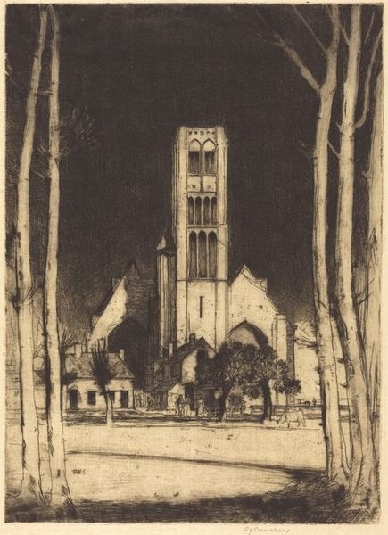 Editor: This is "Olympus (New York)" by Gerald Geerlings, made in 1929 using etching. I find the texture captivating, like a pencil sketch come to life, though somewhat gloomy in tone. How would you unpack the formal qualities of this cityscape? Curator: Indeed. Notice the pronounced verticality and sharp angles, characteristic of many cityscapes but here exaggerated. Geerlings utilizes strong contrasts in light and shadow. Observe the structural composition; the heavy foreground scaffolding acts as a frame. How does that affect your reading? Editor: It feels almost intrusive, adding to the sense of scale, like we're right there in the middle of construction, looking up in awe. What do you think about the varying tones in this print? Curator: The artist’s skillful use of light and dark creates a sense of depth and volume. It leads the eye, doesn’t it? Light emphasizes certain architectural features, creating a staccato rhythm. Do you observe that pattern echoed in the composition as a whole? Editor: Yes, the repetition in the building’s form, the windows and set backs, seems to create a visual parallel. So it seems to be more than a gloomy city rendering but rather it’s playing with light, lines, forms and how our eye moves within the space. Curator: Precisely! It’s a formal interplay. And, for me, this focus renders the city not as place, but as idea. Editor: Thanks so much for clarifying the visual rhetoric being employed here!