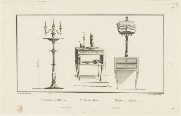 This print, *Tafel met vaas en ronde tafel,* which translates to "Table with vase and round table," was made by de Saint-Morien. The print is likely a design or presentation drawing for furniture, meant for elite consumers. During this era, furniture and interior design became a way for the wealthy to assert their status, reflecting an elaborate culture of display. These pieces would have been part of creating a cultivated identity. The floral arrangement is typical of displays that communicated refinement and an appreciation for nature. Note the clean lines and symmetrical balance, a hallmark of the Neoclassical style which looked back to ancient Greece and Rome for aesthetic inspiration. The objects are meant to inspire feelings of order and harmony which was an ideal of the Enlightenment period. This aesthetic aimed to offer a sense of control in a rapidly changing world. The print not only reflects the tastes of the time but also highlights how the design and consumption of luxury items were intimately tied to social identity.