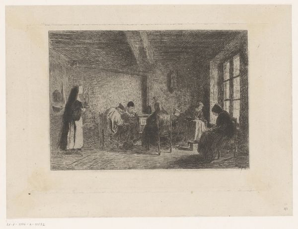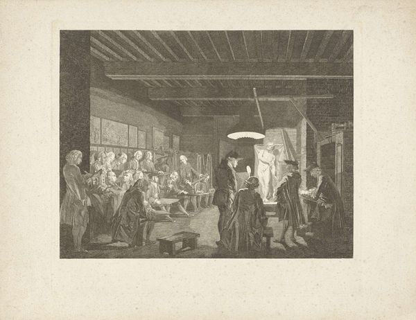 Curator: Here we have Anthony Cornelis Cramer’s, "Herberg met tekenaar en boeren," created sometime between 1852 and 1863. Editor: Right off the bat, I feel this has such a quiet charm, a slice-of-life feeling. The tonal work creates such an interesting mood, almost theatrical, don't you think? Curator: It’s fascinating to observe how genre paintings like these reflected and shaped middle-class values during that period. The tavern becomes a stage for examining everyday social interactions and hierarchies. Note how the artist's inclusion offers another layer, the gaze of the artist adding a critical element. Editor: Oh, totally. There’s this meta element that's hard to ignore, as if Cramer's inviting us to become observers of the observer. The contrast between the relaxed artist in the foreground and the chaotic gathering creates tension and humor. What do you think that overturned chair symbolizes? Curator: Excellent question! In art historical terms, such a seemingly minor detail can represent disorder or disruption, perhaps subtly critiquing social mores of the time, or even mocking their entertainment. These genre scenes, while seemingly benign, often served as commentary on class, morality, and societal expectations. Editor: Yeah, or perhaps just an exceptionally fun night! Seriously, you have to admire the technicality; he balances darkness with light so masterfully! The artist has made this interior come alive in pencil, creating the impression of captured time! The energy practically vibrates! Curator: Absolutely! Cramer captures a fleeting moment. As museums and galleries started exhibiting such works, the narrative itself became a commodity. So "slice of life" became also an exercise in establishing, teaching, and reminding a sense of commonality and belonging. Editor: Wow, hearing about this painting through that perspective truly shifted the way I initially saw it! I felt like an observer of this lively place! Curator: Indeed, art is more than just brushstrokes or pencils. It's a mirror reflecting the world we've built, inviting dialogue and prompting new questions, all over time!