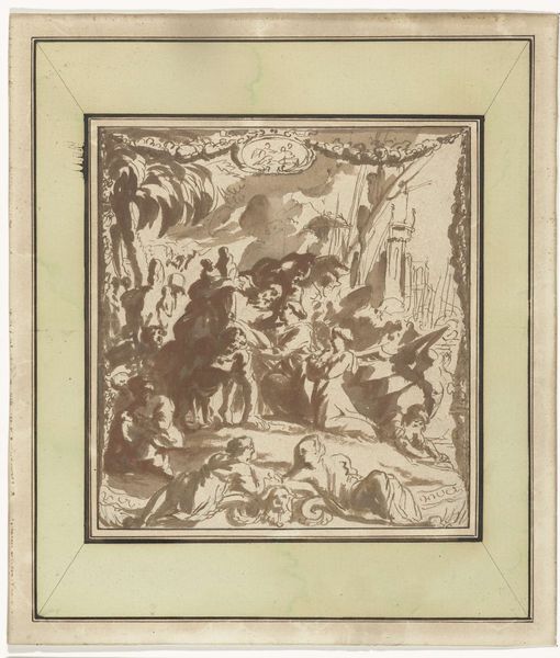 Antoine Sallaert’s rendering of 'Philippus van Macedonië en gevangene Demadius' captivates with its dynamic composition and stark monochrome palette. Rendered with charcoal, the drawing presents a flurry of figures set against the backdrop of stark pyramidal structures. The artist employs agitated lines to delineate the scene. Here, the artist destabilizes traditional notions of victory and defeat. By positioning Philippus, often perceived as the victor, alongside the subjugated Demadius, Sallaert challenges viewers to reconsider established historical narratives. The artist’s choice of medium underscores the drawing’s structural elements. The visible hatching and cross-hatching reveal a semiotic structure of light and shadow. This heightens the emotive and dramatic tension between the figures. The artist uses line and form to pose questions about power, perception and representation. Sallaert’s technique suggests a complex interplay between conqueror and conquered.