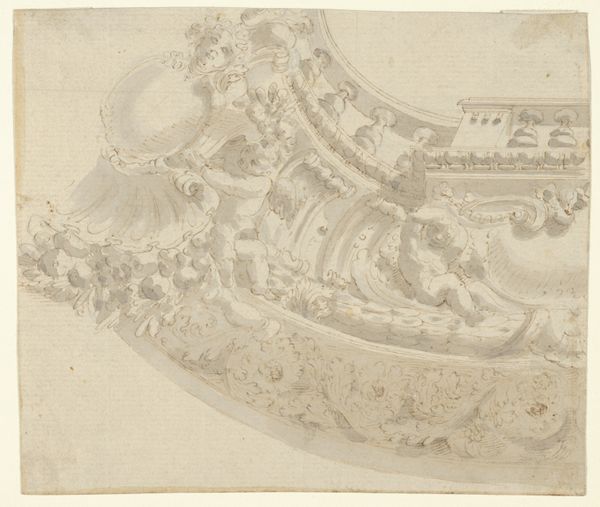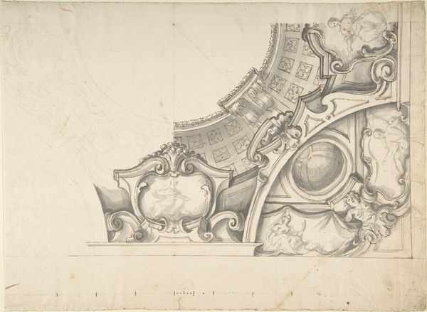 Curator: Looking at this intriguing drawing, a Design for a Curved Ornamental Cove to Support a Dome, likely conceived between 1700 and 1780, invites immediate fascination with the era’s aesthetic ambition. What's your initial read? Editor: Well, there’s an immediate sense of power and control conveyed by these rigid geometric elements—the very lines and shapes declare hierarchy, especially as they reach towards the implied dome, suggesting some upper echelons in its time of creation. Curator: Absolutely, the unyielding pursuit of authority can’t be missed in Baroque designs. Let’s look at what some view as its intention— to dazzle the observer with grandeur. Here we see, in ink and pencil, and potentially some engraving as well, how the architecture could have functioned in service of absolutism. Editor: It makes me think, then, about what exactly they were trying to say about the people under the dome, the implicit messaging conveyed through geometric dominion of an enormous physical and social place…what was society's temperature when this design came about, given these particular proportions? It would be interesting to understand what intersectional experience was like as opposed to only analyzing intention... Curator: I would also point out some symbolism at play; light in such structures—enabled by those curves, would play across surfaces, transforming the experience itself into something... otherworldly. A constructed ideal, I suppose. Editor: An illusion meant to project divine favor? The symbols embedded would subtly underscore the claims to authority... like stagecraft! Do you find its function or artistic skill more dominant? Curator: Here, context is so crucial. Skill is inherent, of course, yet its architectural function, particularly as an instrument to influence perception and potentially further structural power, marks this era profoundly. This design exists now as a ghost of such intentions. Editor: True, what we take away today contrasts vastly with those envisioned outcomes... fascinating, to hold all those threads.