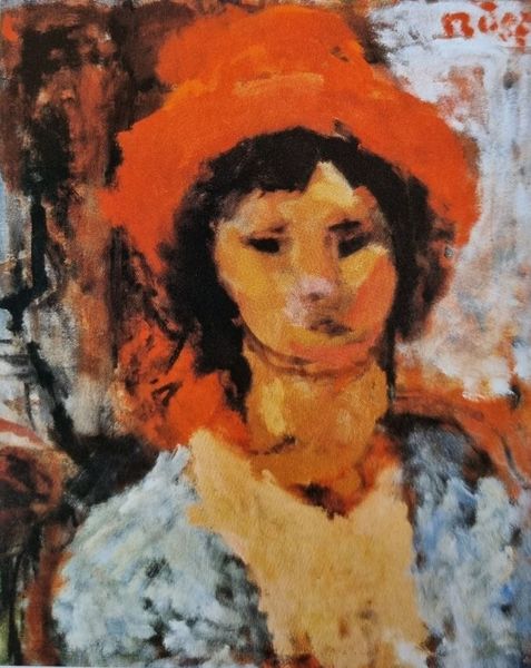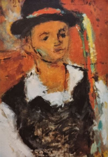 Curator: Here we have "Czóbel Béla Könyöklő Lány" by Béla Czóbel, a portrait executed with oil paints and notable impasto texture. The title translates to "Elbow Reclining Girl." Editor: It possesses an unusual warmth, wouldn’t you say? Despite the heavy strokes and muted palette, the overall effect is surprisingly gentle. The girl’s dark eyes against the rest of her face are arresting. Curator: The intense stare might connect to Czóbel’s expressionistic style and the cultural context of early 20th-century Europe, where interior psychological states were increasingly explored in art. This portrait’s rough texture and visible brushwork are far from academic. Editor: Absolutely, that deliberate lack of polish enhances its rawness. I can't help but see echoes of Modigliani in the elongated face and somber gaze. Do you see this impacting public consumption during its release? Curator: The work shows influence from diverse strains within expressionism, which themselves stem from multiple cultural reference points. To me it reflects not so much influence from other artists, as Czobel having roots in specific geographic context in Hungary, with expressionist and post-impressionist exposure that also includes artists like Matisse and Derain. That places Czobel in an interesting art-historical perspective for Hungarian art within this style. Editor: So rather than an isolated marvel, it's a piece deeply intertwined with broader socio-political art trends. That certainly helps me re-evaluate my first impression. I am interested in what this signifies in broader art history. Curator: And from an iconographic standpoint, the girl’s pink bow provides an interesting juxtaposition, hinting at both innocence and a certain level of societal expectation placed on women. Editor: These are cultural norms visualized. I appreciate now this opportunity to really peel back those layers, and better yet to reveal continuities throughout cultural memory. Curator: Agreed, considering her wistful posture. Well, hopefully visitors have new food for thought as well, and consider what visual cues evoke in our personal experience.
