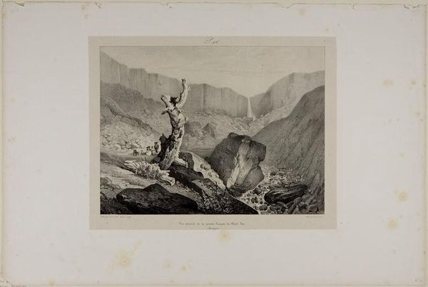 Curator: Here we have James Duffield Harding's "Source du Lison, Franche Comté" currently residing at the Harvard Art Museums. Editor: It’s strikingly dramatic! The dark, looming cave contrasts sharply with the bright, beckoning landscape beyond. Curator: Harding, who lived from 1797 to 1863, captures a romantic sensibility, framing nature as both a refuge and a powerful, untamed force. Consider how this echoes colonial narratives that frame landscapes as raw materials for exploitation. Editor: I'm fascinated by the etching’s composition. The artist uses the cave’s mouth to frame the landscape, creating a sense of depth through contrasting textures and light. Curator: Absolutely, but think about the perspective offered. Who is invited into this scene and who is excluded? The "source" is not simply water but a place of cultural and economic resources. Editor: True, the technique itself guides our viewing. The play of light and shadow is not just aesthetic; it also directs the eye. Curator: Indeed, reflecting on the interplay of light and shadow, and the narrative that is woven, allows us to recognize how landscapes like this have been historically charged. Editor: A powerful reminder of the layers within a seemingly simple scene!