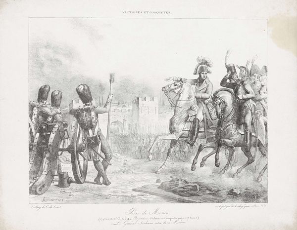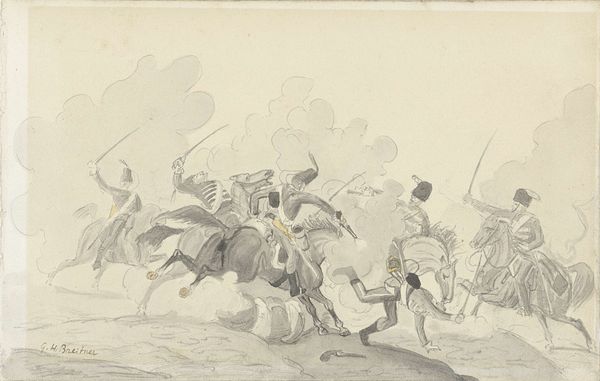 Curator: This print is called "Slag bij Castricum, 1799," which translates to "The Battle of Castricum, 1799." It was created between 1853 and 1861, by an anonymous artist, and you can find it here at the Rijksmuseum. It's an engraving that captures a moment of intense conflict. Editor: It's so dynamic! The chaos of battle practically jumps off the page, doesn't it? Even with the muted tones of the print, there’s a real sense of violence and struggle. I’m drawn to the central figures grappling near the horses. Curator: The Battle of Castricum was a significant event during the Anglo-Russian invasion of Holland, a campaign aimed at ousting French forces and reinstating the Stadtholder. What’s interesting is this print was produced decades after the actual battle, placing it within a broader 19th-century trend of Romantic Nationalism. These images often served to construct and reinforce national identity. Editor: Exactly, the "history painting" genre had a huge role to play in shaping national narratives, which often glorified particular sides and conveniently forgot or downplayed any complexities that contradicted their self-serving nationalist ambitions. You see this mythmaking even within the chosen aesthetic--Romanticism lends itself beautifully to stirring up emotion and idealizing conflict. Curator: Looking closer, notice how the artist balances realism and romanticism. The detailed uniforms and weaponry indicate attention to historical accuracy, yet the composition evokes drama and heroism. This juxtaposition highlights a need to represent history factually, but also with emotion, that's crucial to inspiring feelings of pride and belonging. Editor: Yes, and let’s think about the power dynamics. Who gets remembered as a hero, and who’s relegated to the background or entirely erased from these historical images? Whose perspective is being validated? This piece clearly favors a Dutch national view, casting them in a positive light during the battle, so, who is telling this story is something we must consider. Curator: Examining the role that artworks play in celebrating key moments, one can more deeply understand the shaping of national pride. The print immortalizes not just a battle, but a turning point in Dutch history. Editor: Absolutely, art such as this often functions as more than mere representations—it actively participates in how people come to understand themselves and their place within larger historical narratives. Curator: These works allow us to contextualize its time and culture while recognizing it can fuel or be used to challenge specific agendas. Editor: Exactly, engaging with art critically encourages a much wider awareness of representation.