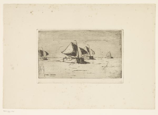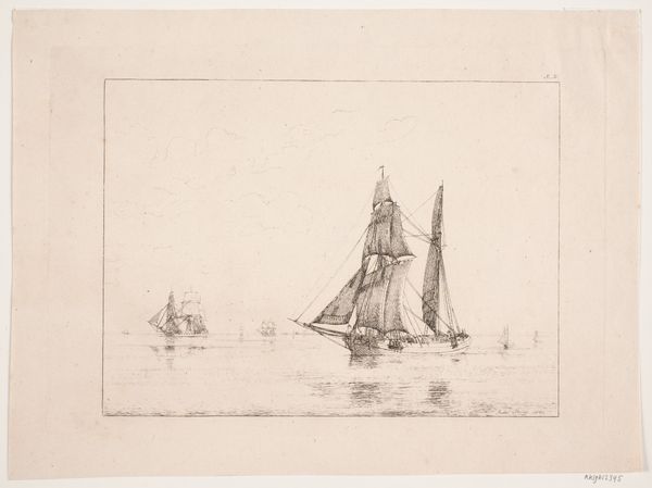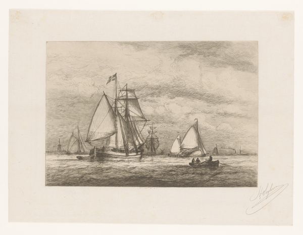Alphonse Stengelin's Zeilschepen op de Noordzee met ondergaande zon, or Sailing Ships on the North Sea with Setting Sun, captures the stark beauty of maritime life through the prominent symbol of the ship and the evocative motif of the setting sun. The ship, throughout history, has carried the weight of cultural exchange, exploration, and the human longing for the unknown. Consider, for instance, the ship's earlier symbolic role as a vessel transporting souls in Egyptian funerary rites, contrasting with its later guise as a Viking longship, emblem of conquest. Here, in Stengelin's etching, the ship is silhouetted against the setting sun which has long been associated with themes of closure and transition. As in Caspar David Friedrich’s landscapes, where the setting sun signifies mortality and introspection, this image evokes a similar contemplation of life's transient nature. It is the allure and dread of crossing thresholds, deeply embedded in our collective consciousness, that Stengelin masterfully touches upon.