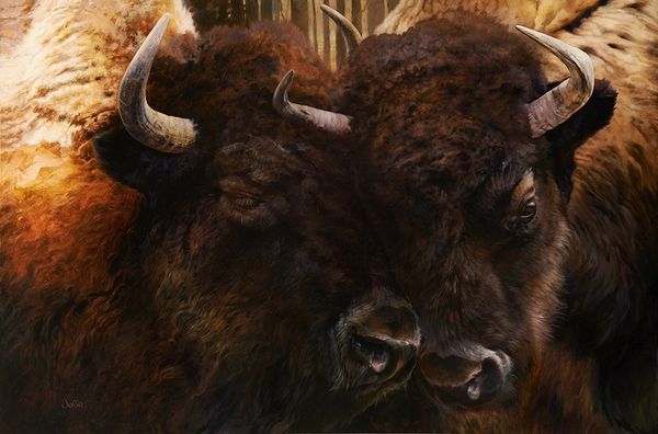 Lucia Heffernan created this oil on canvas painting called 'Wall Street Gothic' in recent years. Heffernan has playfully recast Grant Wood’s iconic ‘American Gothic’ of 1930, and in so doing, she underscores the deep irony of the 2008 financial crisis. The artist's choice of oil paint, traditionally associated with high art, elevates the subjects and enhances their textures. This medium allows for smooth gradations of colour and realistic details that bring out the subjects' furry textures. The animals, the bear and bull of Wall Street, stand before the New York Stock Exchange. Heffernan’s skilled layering of paint creates depth, capturing the tension between the subjects and the setting. The humor is pointed: who is really the rube in this picture? The farmer or the financier? By appropriating a symbol of rural America, and placing the bear and the bull in that composition, she has cleverly commented on the financial crisis and the values it exposed. Ultimately, this painting encourages us to consider how cultural symbols can be reinterpreted to critique social and economic structures.