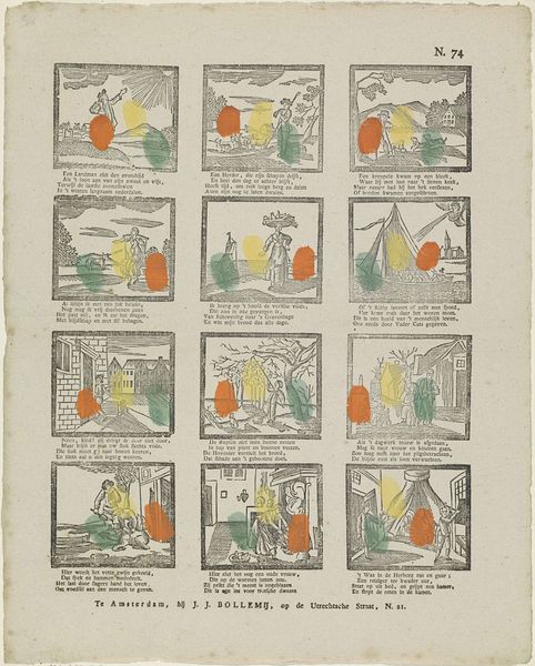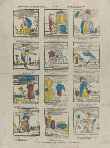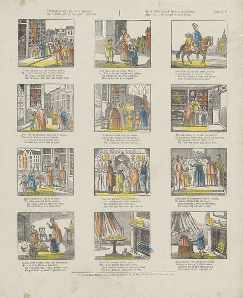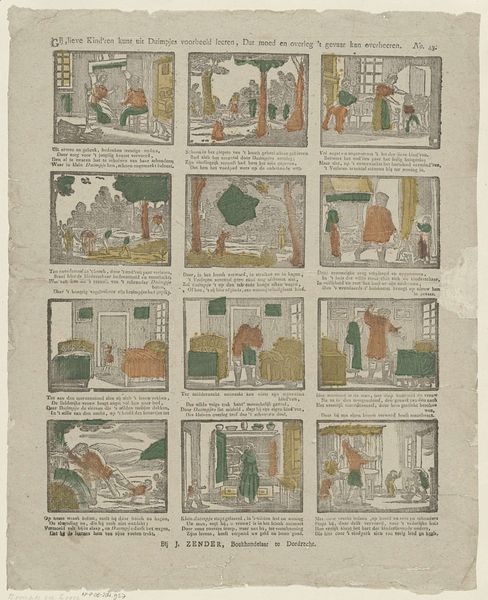 Curator: So, this print, titled "De schikking van het Albestier," created sometime between 1833 and 1900 by J. Robyn, is a rather curious example of graphic art. The individual scenes almost feel like frames from a comic strip. The mood is…didactic? How do you interpret this work? Editor: It definitely has a narrative feel, almost like a visual sermon. The captions beneath each scene make me think it’s supposed to be telling a story, perhaps a moral one aimed at young people. What exactly do you see at play in the history and social context of the image? Curator: Well, I see a layering of power dynamics being subtly reinforced through a veneer of morality. Notice the recurring themes: obedience to authority, the idealization of sacrifice, and the presence of patriarchal structures, even within supposed acts of charity. Editor: So, you are saying it isn't a simple story, but really reflects an underlying political agenda of the time? How? Curator: Precisely. Consider the societal expectations placed upon young people during the 19th century. Through printmaking and popular imagery, such as this example, morality became deeply intertwined with social control. And what role did women play at that time? Editor: If I am understanding correctly, then the etching, due to the patriarchal setting of the 1800's, really shows a reinforcement of strict social hierarchy. Were there particular activist movements that resisted such reinforcement? Curator: Indeed. Proto-feminist movements were gaining traction. So this imagery, which seems benign, can be viewed as a kind of cultural battleground. Did anything change for you when you realized this? Editor: Yes, definitely. Initially, I saw just a quaint, slightly preachy illustration. But viewing it through this lens reveals the complex power structures that shaped its creation and consumption. Curator: Absolutely. It reminds us to look beyond the surface, questioning who benefits from the narratives presented to us. Editor: I never thought of popular prints as tools of social influence. I see them now as holding power!