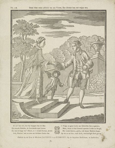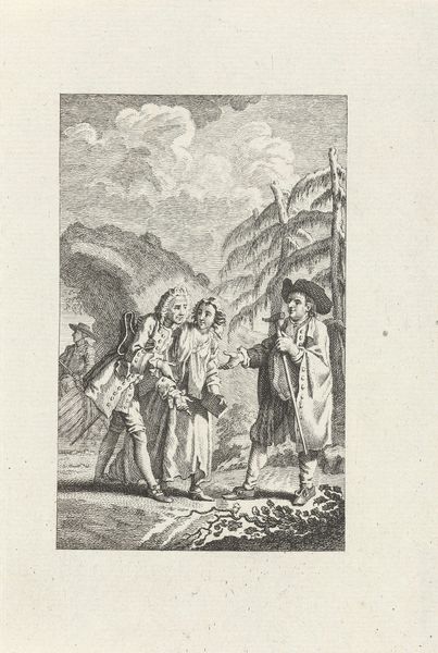 Editor: This is "Paar bij maaiers en korenschoven," or "Couple with mowers and sheaves of wheat," an engraving by Philippus Velijn, dating back to 1820. I’m struck by the almost theatrical way the couple is posed amidst what looks like a harvest scene. How do you interpret this work, especially considering its time period? Curator: That's a keen observation about the theatricality. Considering the period, 1820, we’re at the tail end of the Napoleonic era and squarely in the rise of Romanticism. These idealized depictions of rural life, like Velijn's engraving, weren't just innocent scenes. They actively served as a nostalgic counterpoint to the rapid industrialization and urbanization taking place. What social function do you think such an image could serve? Editor: Maybe it's a way for the elite to romanticize the lives of those who labor, creating a sense of order and contentment in a time of great social upheaval? Almost like propaganda? Curator: Exactly. The “common folk” are recast into palatable and non-threatening forms. Consider the clothing – slightly anachronistic, invoking an imagined idyllic past, divorced from the realities of agrarian life and the harsh economic realities for many. Velijn offers us a very controlled vision of Dutch society here. Does this idyllic interpretation sit well with you, given our historical context? Editor: Not really. It's interesting how this seemingly peaceful image actually masks a lot of complex socio-political ideas. I'll definitely view these kinds of scenes with more critical eyes now. Curator: Precisely! That’s the key - art often reflects and shapes the cultural and power dynamics of its time, revealing as much as it conceals.