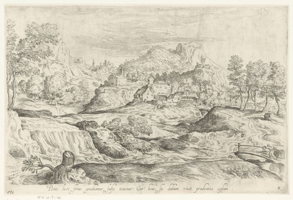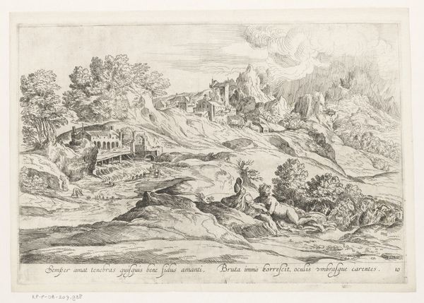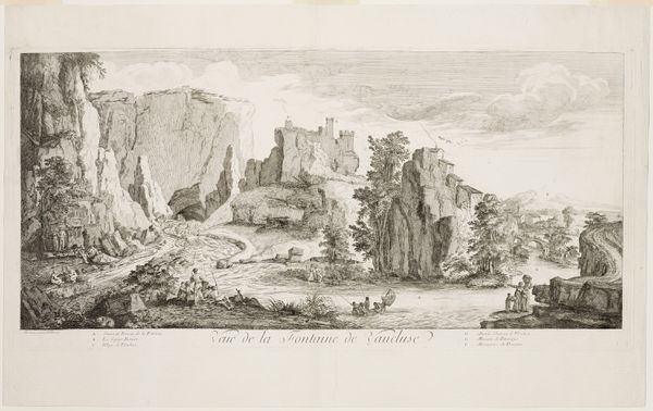 Curator: Jean-Baptiste Corneille gives us "Landschap met steile heuvel", dated sometime between 1659 and 1695. It's rendered as a print, specifically through etching. Editor: My immediate impression is one of profound depth created by those varied lines. They give it such an evocative, almost dreamlike, quality. It's really compelling how those fine lines construct the forms. Curator: Indeed, the baroque landscape aesthetic is rather apparent in the etching style—the sweeping vistas, dramatic light. Do you notice the human figures? Corneille embeds elements that speak of human toil amidst such a vast landscape, thus telling a specific kind of story of the times. Editor: I do! But what’s really fascinating is the contrast in the mark-making. See how he uses a denser, almost frantic etching for the foreground elements like the rocky terrain and those trees? The way those details fall off with depth of field only amplify its dynamism. It has movement through purely visual manipulation. Curator: That stylistic choice would also play a socio-cultural role back then, because baroque's inherent dynamism was associated with grandeur, power, often mirroring the social structures and ambitions of royalty and aristocracy during the era. Editor: Do you think, through these intense visual contrasts and the layering of such intricate detail, the artist creates a tension between the observable and the subjective, questioning whether he is celebrating nature itself, or imposing an aesthetic sensibility onto the natural world? Curator: Yes! Absolutely, one could also consider the material impact – etching lent itself to wider reproduction, thus democratising landscape appreciation and art ownership at the time, thereby affecting societal access. Editor: All this textural dynamism…It's just incredible how the sheer meticulousness shapes our reading of the whole image! Curator: And seeing its lasting contribution to landscape aesthetics makes engaging with this work truly worthwhile, I would argue. Editor: I concur. We’ve really untangled layers that exist beyond mere depictions of pastoral harmony.