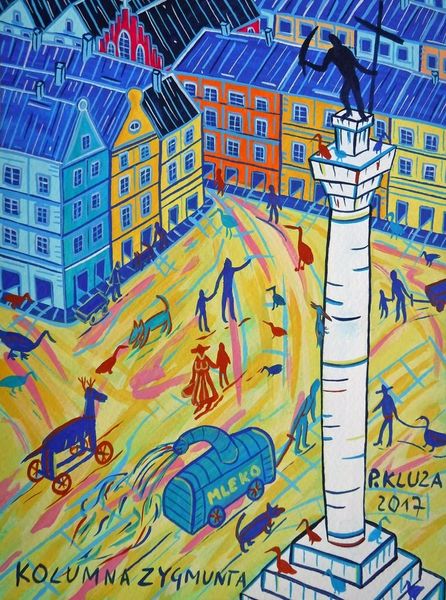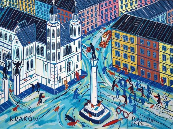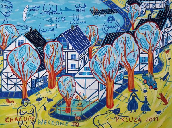Paweł Kluza made this painting, Okęcie, with what looks like acrylic paint, in 2017. The way Kluza applies the blues, layering them on top of each other, makes me think about artmaking as a process of discovery, of seeing what happens when you put one color next to another. The surface of the painting has a tangible quality, with visible brushstrokes that catch the light. I'm drawn to the way the paint is applied in thin, transparent layers, creating a sense of depth and luminosity. The stark buildings and leafless tree could be dismal, but the sky-blue palette gives the scene a kind of optimism. I keep going back to the tree in the middle, with its branches reaching up towards the sky, like an offering. Kluza's style reminds me of outsider art, where the focus is on raw expression and unfiltered emotion. It’s all about embracing the unexpected and finding beauty in the imperfect.