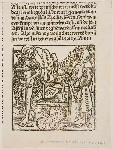 Curator: Here we have chapter 51, "Keeping Secrets," an intriguing anonymous print held at the Harvard Art Museums. Editor: The stark contrasts immediately strike me. The stark black lines create a mood of guardedness. It is as if light itself is struggling to penetrate the scene’s somberness. Curator: The composition is quite deliberate. Notice the walled enclosure in the background, visually reinforcing the idea of confinement and unspoken truths. Semiotically, we can read the wall as a barrier, literally and figuratively. Editor: Indeed. I see the woman tending to the man’s head as an act of both care and constraint. She is the keeper of his secrets, and perhaps her own. Are those classical references inscribed in the margins on the right side? Curator: Yes, texts from Seneca, Job, and Cato offer moral instruction on the importance of silence and discretion. The image and text together construct a didactic narrative on the burdens and consequences of revealed secrets. Editor: It's a potent reminder that some burdens are best carried alone, even if that isolation is born of protection. It’s fascinating how much emotional weight these simple forms convey. Curator: The power lies in its formal austerity. The composition, the line work, they all contribute to a cohesive and rather intense message about the weight of silence.