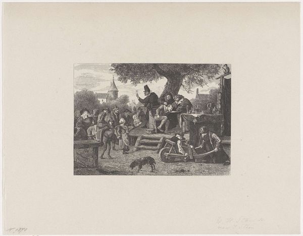 Reinier Vinkeles created this print titled "Aftocht van de Britten en Russen uit Den Helder, 1799" using etching. The composition draws the eye from the ships in the distance to the figures in the foreground, creating a sense of receding space. The buildings on the right act as a visual anchor. Vinkeles skillfully uses line and shading to define the forms of the people, ships and architecture. As a historical record, the print embodies the symbolic meaning of the event it depicts, the retreat of British and Russian forces. Vinkeles uses a semiotic system of signs through the detailed depiction of uniforms, flags, and the expressions on the faces of the figures. These visual components work together to create a narrative. The enduring interest in Vinkeles’ print lies not just in its historical value, but also in its formal qualities and how it reflects the intersection of artistic skill.
