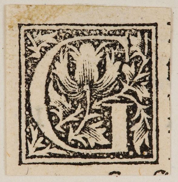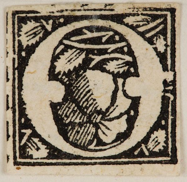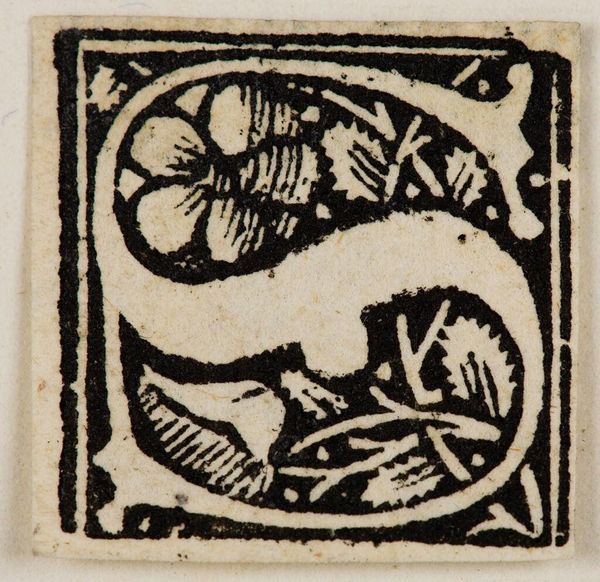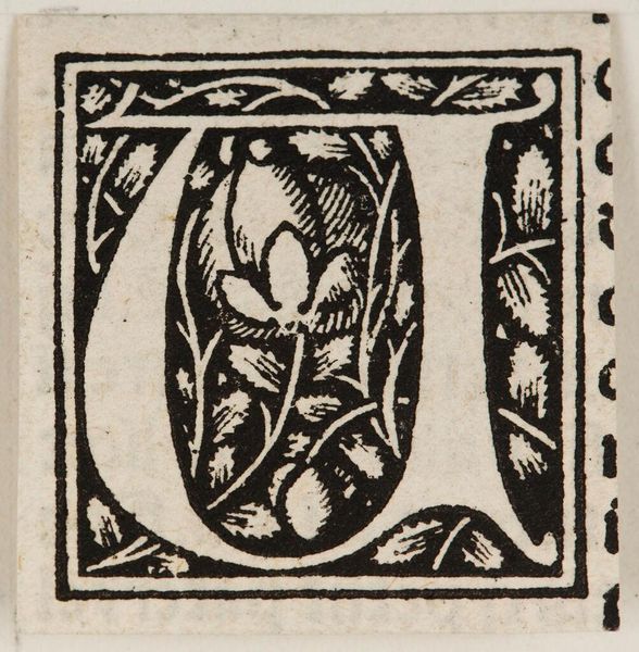 Editor: This is "Initial D" by an anonymous artist, located at the Harvard Art Museums. It’s such a small, detailed piece. What strikes you most about the composition? Curator: The stark contrast between the black ink and the white space is immediately compelling, wouldn't you agree? Observe how the artist uses hatching and cross-hatching within the "D" to create a sense of depth and texture, and consider the border. Editor: Yes, the border really frames it. How does that contribute to the overall effect? Curator: It functions to contain the visual energy. The dense, almost chaotic detail within the letterform is then juxtaposed against the rigid, geometric structure of the border, producing a visual tension. Have you noticed the leaves in the background? Editor: Now that you mention it! I had missed that entirely. Thank you! Curator: Of course. It's a strong example of thoughtful design.