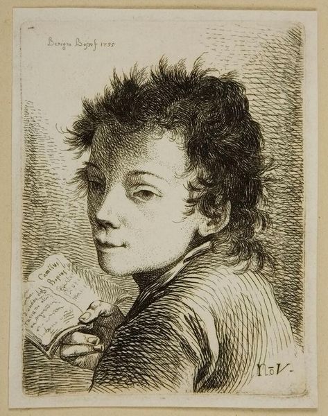 Curator: Here we have Jacob Ernst Marcus’s 1811 engraving, "Portret G.J. Michaelis," residing at the Rijksmuseum. I'm struck immediately by the stark clarity of the lines, the careful hatching. There’s a real elegance to it, wouldn’t you say? Editor: It feels almost industrial. The subject, palette in hand, becomes almost an artisan producing commodities, which might resonate with the shift of artist's production to mass-produced works. The lines are so precise; they give it a somewhat alienating effect. Curator: Interesting take! I find that precision heightens the sense of detail, typical of neoclassical portraiture. Note how the hatching not only models form but creates distinct tonal values, adding a remarkable depth, as does the way the eye follows his direct gaze to the composition's apex: the subject’s soft curls. Editor: I am curious about the engraver's studio space—were there standardized sizes of copper plates? Was he perhaps using ready-made tools, things not custom-made but purchased from the factory? The very essence of engraving, a reproducible image, invites exploration into the printmaking practice itself, something we don't often consider. Curator: True enough. This focus does align well with the ideals of Neoclassicism—the revival of classical forms through exacting artistic and mechanical precision and its visual order! Think of the Enlightenment's fascination with reason and clarity. The artist, following Marcus' lead, used these linear means to define his likeness during a particular era and artistic movement. Editor: It's more than a face; it represents the era’s own technological capacity and standardization of production and even consumption, beyond simple questions of likeness. His steady hand could be replicated mechanically to make copies... Curator: But to dismiss it as *just* a representation of technology overlooks the sensitivity in capturing Michaelis' features, and the skillful handling of line that creates light and shadow. The engraver elevates it beyond mere technical skill. Editor: Agreed. Seeing it, though, compels a consideration of the craft itself: the relationship between labor, materials, and even consumer culture that the artwork comes into, challenging, as it does, those arbitrary separations. I leave appreciating its complexities all the more. Curator: Absolutely! Through line and tone, we begin to perceive how “Portret G.J. Michaelis” captures something unique even through replication, not only reflecting its subject but also engaging broader artistic and philosophical currents.