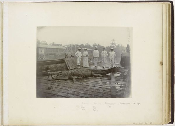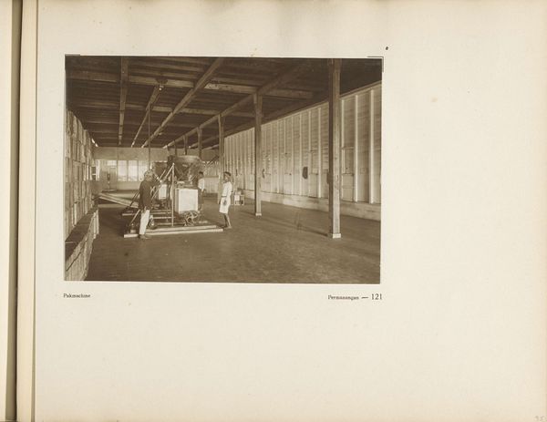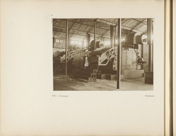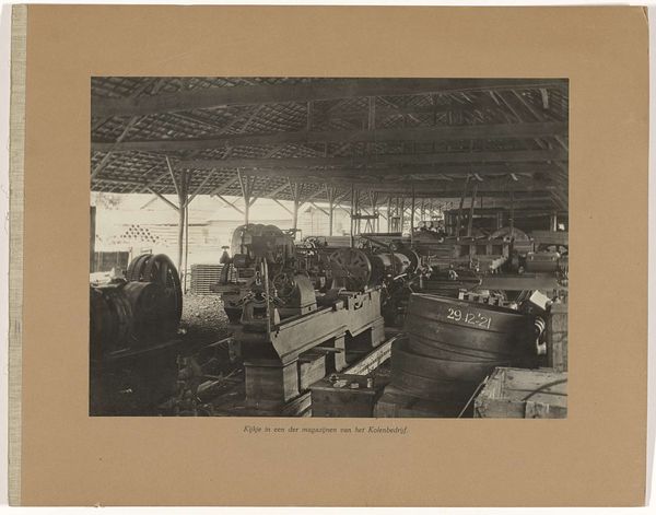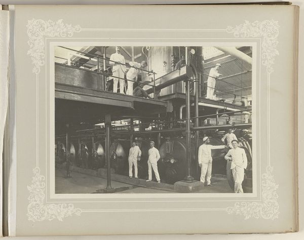 Curator: This gelatin-silver print, entitled "Machinewerkplaats," meaning "Machine Workshop" in Dutch, was captured sometime between 1900 and 1910 by an anonymous photographer. Editor: Oh, there’s a beautiful somberness to it. It’s fascinating how the light catches those various machine parts… creating an orchestra of shadow. There is a tangible mood in this photograph of work in the beginning of the 20th century. Curator: Indeed. The photograph offers a rare glimpse inside a workshop of the time. It strikes me that you feel how meticulously constructed the workshop space looks and also that those machines seem very present and are also being documented. They appear nearly as subjects themselves and I can see how much work and ingenuity are woven into these scenes. Editor: Yes, but also those men standing in the middle seem very self-aware. Perhaps it's their gaze, which makes me curious about their stories, the nature of their labour, the items they fabricate in this space and even their clothes. It highlights how our interactions with the work itself transform it as it is used by workers, which is how materials acquire history. The very medium—the gelatin silver print itself—relates directly to the rapid mechanization during that era! Curator: True. It speaks volumes about the artist's vision and how the means of creating such photography must have influenced art creation as well as the life of laborers like those who pose there with pride. The print captures not just an image, but the spirit of a generation caught in an era of technological and social change. Editor: It truly underscores the beauty found in ordinary existence! From materials to method to manpower, this piece leaves a quiet rumination about the very idea of process and change during the early twentieth century... It’s almost a portrait of progress itself.