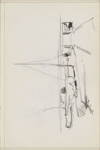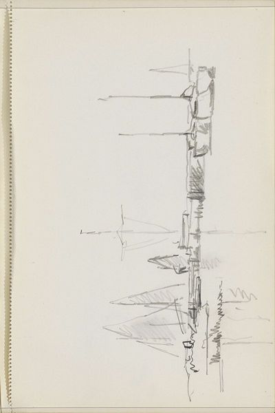 Curator: This pencil drawing, entitled "Zeilschepen bij een waterkant", was created by Cornelis Vreedenburgh sometime between 1890 and 1946. It currently resides here at the Rijksmuseum. What are your initial thoughts? Editor: It has an incredible sense of immediacy, like a fleeting impression caught on paper. The tentative lines almost seem to vibrate. Curator: Vreedenburgh, as with other Realist artists of this period, was focused on accurately depicting what he observed in the world around him. Consider the labor involved in the scene. This drawing might be seen as evidence, a witness to labor. Look at how those ships were manufactured and then actively manned and sailed, day after day, often in harsh conditions. Editor: That’s interesting, yes, but look closer at the spars and masts—the iconic shapes of these sailing vessels immediately evoke a sense of exploration and trade. They're symbols of a culture inextricably linked to the sea. Do the forms of the boats create a narrative about cultural and commercial exchange? Perhaps of naval power, or colonial aspirations? Curator: Perhaps, but focusing only on the symbolism obscures the very real, material conditions. A pencil drawing of this nature serves also as record and reflection of an economic process tied to naval power as it transformed Europe at that time, due to the materials these boats were built from: the trees felled to create masts and hulls and the textile manufacture that made their sails. The raw pencil on the page offers an opportunity for insight, revealing production through the artist's mark making. Editor: I suppose that, taken together, we can begin to examine the symbolic weight of something like trade. Those ships represented so much more than timber, but also aspirations. It’s fascinating how such a quick sketch manages to suggest something larger and transformative. Curator: Indeed, seeing art through the lens of materiality encourages viewers to consider not just the image but the very real networks of labor and materials that bring it into being. Editor: And analyzing it for symbolic resonance helps uncover how images gain meaning and leave a lasting imprint on the human consciousness.