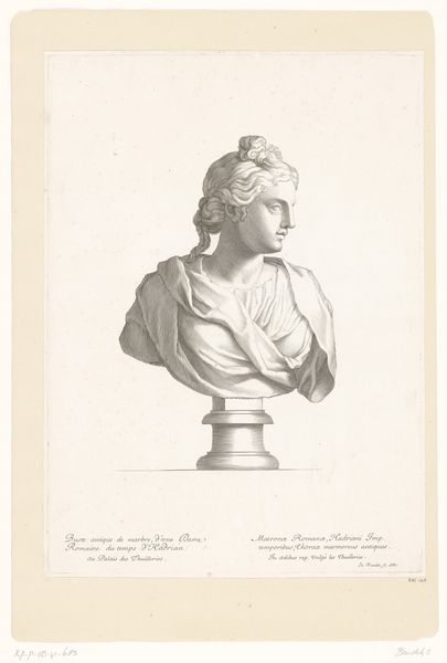Etienne Baudet created this engraving, "Antique Bust of Emperor Hadrian", sometime in the late 17th or early 18th century. Notice how Baudet’s composition meticulously captures the texture and form of the marble bust, employing delicate lines to define Hadrian’s curly hair and beard. The artist uses hatching and cross-hatching to sculpt three-dimensional forms and add depth, rendering the textures of fabric, stone, and skin. Consider how the artist creates a sense of dynamism within the static form through the contrasting textures, particularly in the drapery and armor, imbuing the emperor's image with vitality and power. Baudet invites us to consider how the visual language of classical art—with its emphasis on order and reason—was being reinterpreted and repurposed during the Enlightenment. The engraving serves not merely as a reproduction, but as an active re-engagement with classical ideals through the lens of Baroque aesthetics.