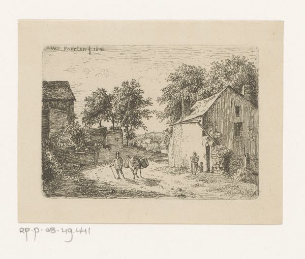 This print, by Charles Jacque, presents a woman and child on a farm. Its effect depends entirely on the method used to create it: etching. This intaglio process involves covering a metal plate with a waxy ground, then drawing through it with a needle to expose the metal. The plate is then immersed in acid, which bites into the lines. After the plate is inked and wiped clean, the ink remains in the etched lines, ready to be printed onto paper. Jacque’s skill is evident in the varied textures he achieves through different densities of lines, creating a sense of light, shadow, and depth. Notice the thatched roof, created with dense, multidirectional marks, contrasting with the sparse lines defining the sky. Jacque uses line work to describe not just the scene, but the feel of the materials depicted. The print invites consideration of the labor involved in both its creation, and the farm life it depicts, reminding us that art-making, like agriculture, relies on skilled work. This connection between process and representation prompts us to reflect on the value we assign to different forms of labor.