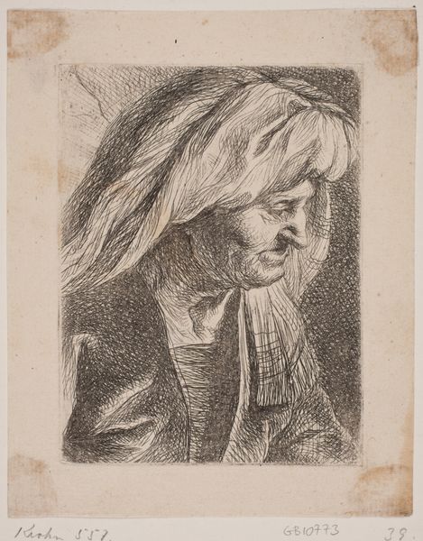 Editor: This is Rembrandt van Rijn’s “Old Woman Sleeping,” an etching made sometime between 1620 and 1986. I find the image quite compelling; the fine lines capture the weight of age and exhaustion. What do you see in this piece? Curator: Beyond the masterful technique, I see a potent commentary on the often-overlooked lives of women, particularly older women, within 17th-century Dutch society. Rembrandt made a lot of portraits. How do you read it within the tradition of portraiture and representation, which frequently favored nobility or celebrated idealized beauty? Editor: That’s a great point. It seems so…unglamorous compared to typical portraits. This feels like it could be more personal than that. Curator: Precisely. The print complicates a conventional narrative. Is Rembrandt capturing a 'truthful' likeness, or is there another element? How does this work fit within a broader examination of aging, labor, and gender roles of the period? How might a feminist lens impact our understanding of its subject? Editor: The subject does look tired, and not just physically. It’s like life has taken a toll. I’m used to thinking of subjects who look powerful or important. Curator: It's a radical gesture, centering a figure rendered vulnerable and ordinary by time and circumstances. Moreover, by immortalizing her, what commentary might it propose regarding social justice? Consider the implications of giving this person space and consideration through art? Editor: I guess it's easy to forget that even seemingly simple portraits can have all these layers of meaning tied to societal issues. I'll never look at Rembrandt the same way. Curator: Exactly! By delving deeper into socio-political contexts, it broadens the picture, providing fresh perspectives on the work of art.