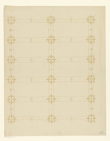 Editor: We're looking at "Stencilled Wall" created between 1935 and 1942 by Mildred E. Bent. It’s a watercolor and stencil on paper. I’m struck by how delicate and almost homey the patterns feel. What do you see in this piece? Curator: I see a vibrant echo of early American decorative traditions. This piece reminds me of the stenciled decorations that adorned the walls of homes in the 18th and 19th centuries. Consider how these simple, repeated motifs of flowers and geometric shapes become powerful signifiers of domesticity, a kind of visual shorthand for ‘home.’ Does this resonate with your impression? Editor: It does, definitely. It makes me think of folk art, almost like a craft passed down through generations. Were these types of patterns common at the time? Curator: Yes, stenciling was a cost-effective way to add color and individuality to interiors. The limited palette – reds, greens, and this earthy yellow – further roots it in that historical aesthetic. We see how cultural memory persists, shapes itself across generations through repeated symbols. And remember the context of the 1930s and 40s. A renewed interest in historical precedent likely grew out of a desire to evoke earlier traditions and national identity during a period of social and political uncertainty. Editor: So, this isn’t just a pretty pattern, but it’s loaded with cultural information? It makes you wonder what messages it might have been carrying back then. Curator: Exactly! Each flower, each leaf, each precisely placed stencil speaks volumes. Thinking about Mildred Bent's intentions, it's not just design. What feelings might these evoke? Editor: It’s fascinating how something so seemingly simple can reveal so much about a particular time and place. It really gives new meaning to ‘wallpaper’! Curator: Precisely. That wallpaper really makes one think of identity and culture.