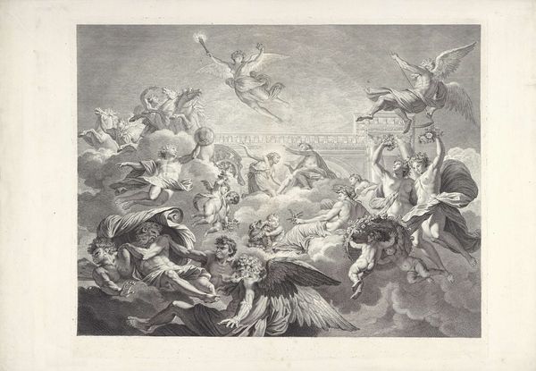 Jan Brueghel the Elder created this allegorical painting, Air, using oil paints, a painstaking and skilled practice at the time. Brueghel's mastery is evident in the smooth, luminous surfaces achieved through layering thin glazes of oil paint, allowing light to interact with the colors beneath. The sheer number of figures, and the range of textures of feathers, flesh, and cloud, is simply astonishing. Note too how he achieves an atmospheric perspective, with the background fading softly into the distance. The detailed rendering of flora and fauna showcases the artist’s technical prowess but it also points to the cultural significance of naturalism during this period. Brueghel's artistry elevated the genre of still life and landscape painting, reflecting a growing interest in the natural world, and perhaps, an attempt to assert mastery over it. The painting's intricate details, combined with the labor-intensive process of oil painting, underscore the value placed on artistic skill and craftsmanship in the 17th century. It is a testament to the enduring appeal, and inherent worth, of patient manual work.
